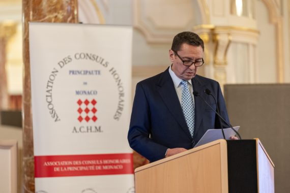 Photo : M. Marc Lecourt, Président de l’A.C.H.M. et Consul Général honoraire de Slovénie à Monaco, pendant son discours lors de la cérémonie de nomination “Membre d’Honneur” pour Mme Marie-Catherine Caruso Ravéra et M. Thomas Sanmori.