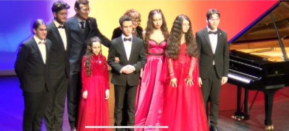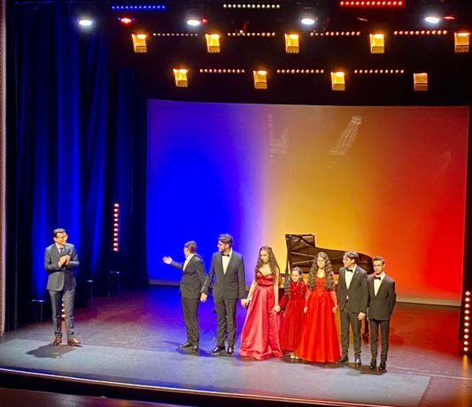 Photo : le Dr Constantin Turchina, Consul Général honoraire de Roumanie, félicitant les jeunes virtuoses roumains à l’issue du spectacle musicale très réussi.
