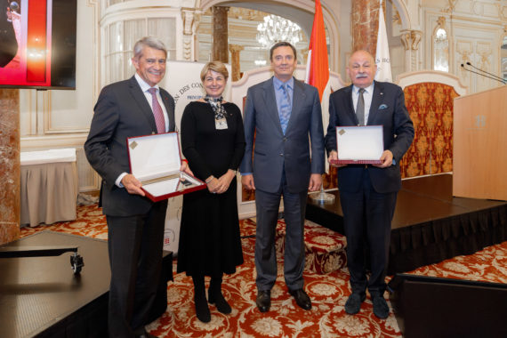Photo (de gauche à droite) : A l’issue de leur nomination “Membre d’Honneur” et la remise du traditionnel plateau en argent, le Lieutenant-Colonel (e.r) Laurent Soler, ancien Chambellan de S.A.S. le Prince Albert II, Mme Isabelle Berro Amadeï, Ministre d’Etat par Intérim, M. Marc Lecourt, Président de l’A.C.H.M. et Consul Général honoraire de Slovénie à Monaco, et le Colonel Luc Fringant, 1er Aide de Camp du Prince Souverain et ancien Chambellan de S.A.S. le Prince Albert II. © Landry Basile – Réalis Photo